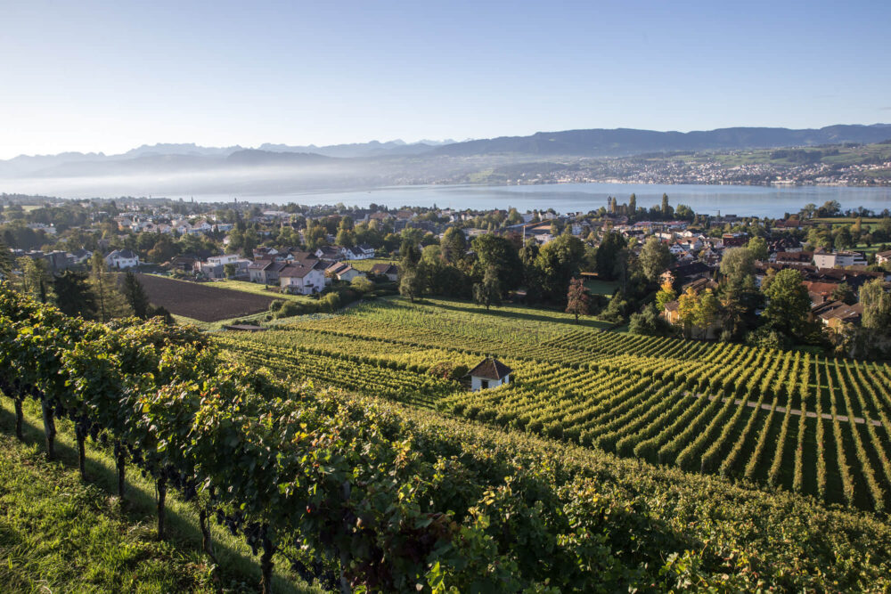 Der Glarner Föhn, trocknender Biswind, Morgennebel, viel Sonne, eine optimale Bodenbeschaffenheit – zusammen verleihen sie dem Zürichsee-Wein seinen ganz besonderen Charakter. In diesem einmaligen Klima bewirtschaften wir auf unserem geschichtsträchtigen Weingut in Uetikon am See mit viel Handarbeit 6,8 Hektaren Rebland mit neun Traubensorten. Hier über dem Zürichsee keltern wir aus sorgfältig gehegtem und gepflegtem Traubengut Jahr für Jahr Spitzenweine von erstklassiger Qualität.